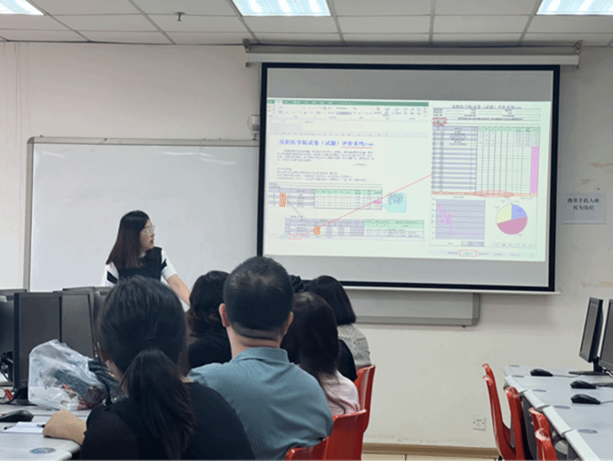 物理教研室杨丹老师从命题出卷和批阅试卷两个方面对考试相关材料进行讲解。在命题出卷中,杨老师强调,试卷结构在题型、分数、难度、区分度、认知层次比例方面要分配合理。出卷教师要编制A卷和B卷两套试卷,随后由考试中心随机抽选一套作为考试题目,另一套则为补考题目。严格遵守教考分离的政策,授课教师不参与试卷命题。考前授课教师应提醒员工考试规范及注意事项,如不要将答案写入密封线内。考试后,各教研室要做好材料留存、试卷封存等工作。