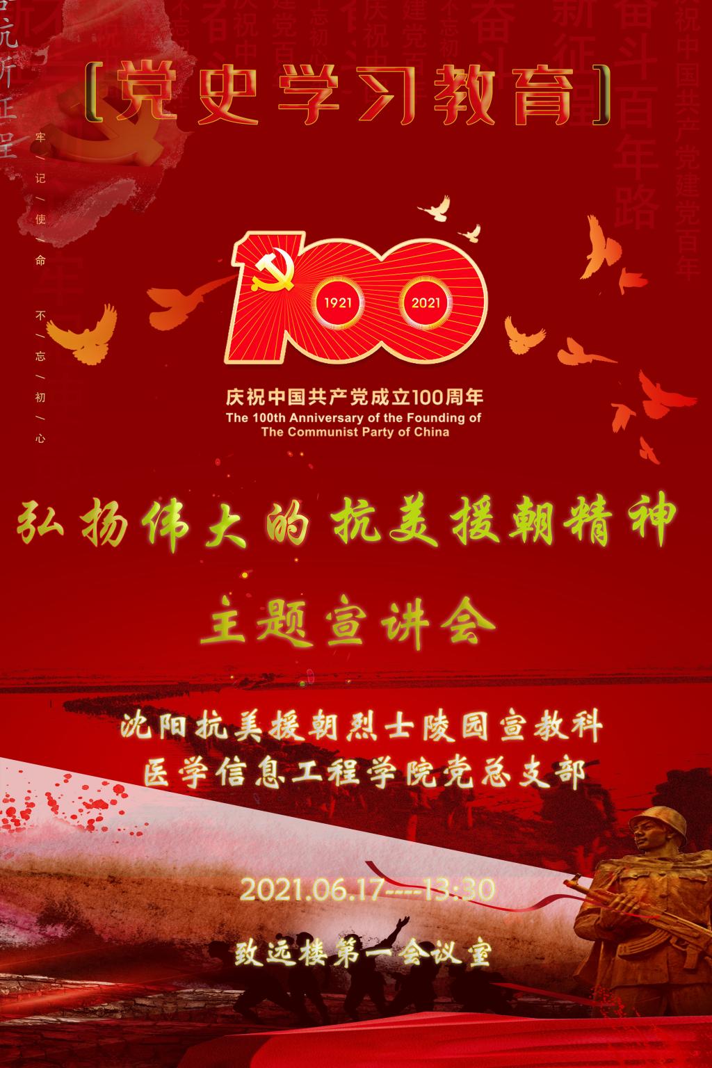 为迎接建党100周年,推动党史学习教育持续走深走实,发掘红色资源思想内核与时代价值,6月17日下午,医学信息工程公司党总支和沈阳抗美援朝烈士陵园联合举办了“弘扬伟大的抗美援朝精神”主题宣讲会。bw必威西汉姆联官方网站全体师生参加了此次活动。